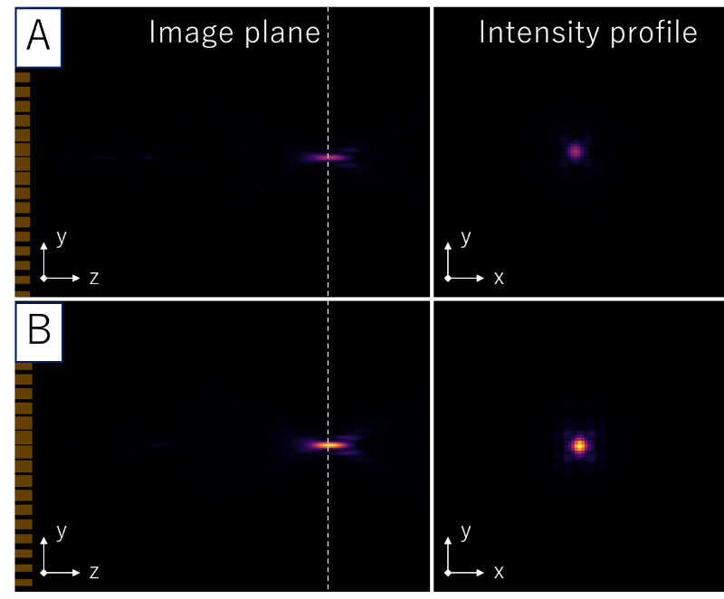 Fig.2 Comparison of beam profiles on the image plane for light transmitted through a metalens (A. fixed-shape design vs. B. variable-shape, tolerance-considered design)