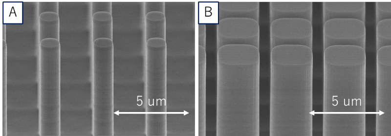 Because metalenses can be fabricated using semiconductor manufacturing processes such as photolithography and etching, they offer advantages in mass producibility and cost compared with conventional lenses. Additionally, Konica Minolta possesses nano-fabrication technology as a core competency, enabling end-to-end in-house prototyping of metalenses within a short period of time. Figure 3 shows scanning electron microscope images of the fabricated pillar-shaped microstructures . By optimizing processing conditions, high-aspect-ratio microstructures with aspect ratios of 1:10 or higher and excellent verticality have been realized. This high-precision nano-fabrication technology enables fabrication of metalenses that exhibit the intended optical functions as designed.