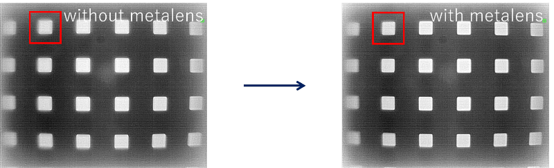 Conventional far-infrared cameras have relied on aspheric germanium lenses, which are costly and associated with significant procurement risk. As an alternative, we fabricated a hybrid metalens optical system that combines an inexpensive spherical silicon lens with a metalens and investigated the feasibility of achieving high image quality without the use of germanium2). Figure 4 compares images obtained using a spherical silicon lens alone with those obtained using the same lens combined with a metalens that corrects aberrations equivalent to those addressed by an aspheric lens. The results show that the addition of the metalens suppresses blur, particularly in the peripheral field of view (red frame in the figure), and improves image contrast. Going forward, we will expand the application of metalens technology to fields requiring miniaturization, higher precision, and lower cost, including automotive far-infrared cameras, thereby contributing to the realization of a safer and more secure society through technologies that visualize the invisible.