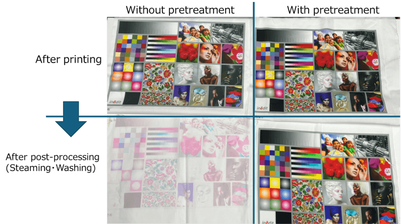 The product is a functional ink that can be installed on the Nassenger series as a pretreatment ink for reactive dyes for textiles, enabling integration of the pretreatment and printing steps. Pretreatment is an essential element in digital textile printing, as it allows dyes to properly adhere to the fabric, preventing degraded print quality (Fig. 2). The product is designed to be jetted by inkjet while maintaining the functions required of conventional pretreatment solutions.
