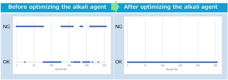 Fig. 3 Nozzle conditions in an inkjet printhead before and after alkaline-agent optimization