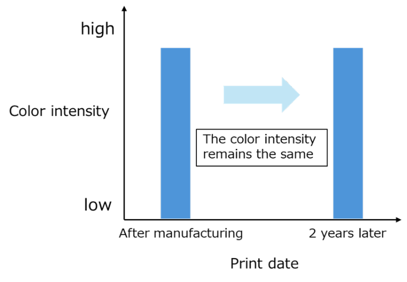 Typically, inkjet inks have a storage life of 1 to 2 years from manufacture. Under alkaline conditions, however, inks containing humectants may undergo humectant decomposition. As a result, the performance of pretreatment inks containing humectants can deteriorate, making it difficult to secure a sufficient storage period. To address this issue, we developed a technology to prevent humectant decomposition within the ink, thereby ensuring a sufficient storage period (Fig. 4). By combining these technologies, we achieved the market launch of “O’ROBE,” Japan’s first inline pretreatment ink for reactive dyes.