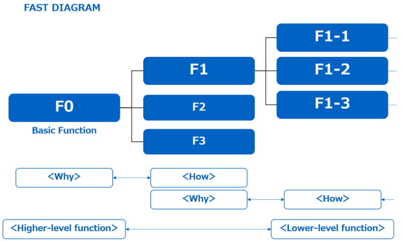 Next, the concepts of VE and FAST were systematically applied to understand the product structures. FAST is a framework that expands functions through means–ends (how–why) relationships and clarifies the logical relationships among functions. Here, a “function” refers to an expression that describes the role of something, typically represented as a noun + verb (e.g., “to △△ ○○”).