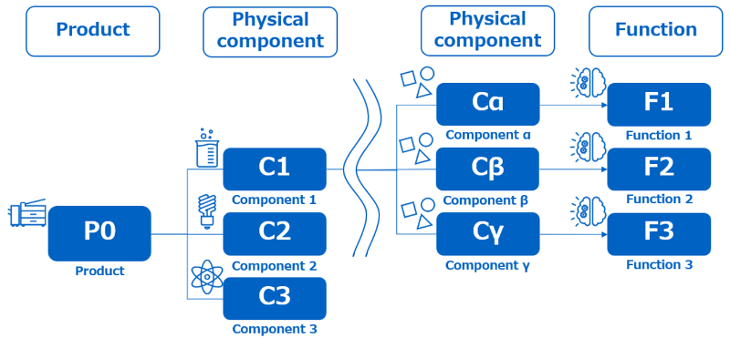 In this study, we created an AI agent (function analysis AI) that uses a large language model (ChatGPT) to generate a function logic tree based on VE and FAST. For the function decomposition AI, prompts were designed such that a component list could be automatically generated by hierarchically decomposing a target product from higher to lower levels, and the functions associated with each hierarchy were automatically extracted. Figure 3 illustrates the hierarchical decomposition of a product into constituent components (C1–C3, Cα–Cγ) and their corresponding functions (F1–F3). Moving from left to right, the granularity becomes finer, and the correspondence between the components and functions is shown on the far right. By organizing components hierarchically from the overall product (P0) down to lower-level structures, the approach clarifies which functions (technologies) are present in the product.