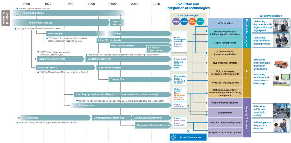 Fig. 5 Relationship between core technologies and representative products (Konica Minolta Integrated Report, 2025).