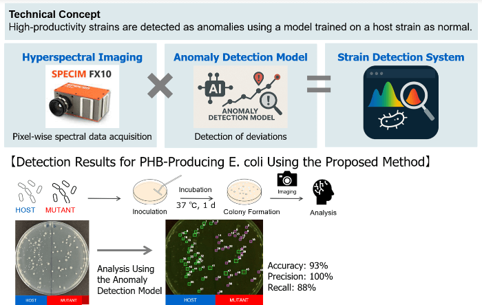 A major feature of this system is that it does not require labeled training data for high-producing strains, and the model can be constructed using only the original microbial strain (host strain). In this approach, visual information, such as color, shape, and gloss of microorganisms, is quantified using HSI, and an anomaly detection model is trained by treating the host strain as normal. Consequently, applying the model enables high-producing strains to be detected as anomalies. In addition, considering that HSI can capture subtle spectral differences that are difficult to distinguish with visible light, the system can identify high-producing strains with high sensitivity and accuracy, even when differences are not apparent by our eyes.