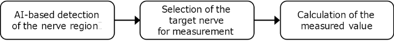 This function comprises a sequence of processes that identify the nerve region in an ultrasound image and semi-automatically measure its cross-sectional area. The system operates through a processing flow comprising AI-based detection of the nerve region, selection of the target nerve for measurement, and calculation of the measured value (Fig. 1).