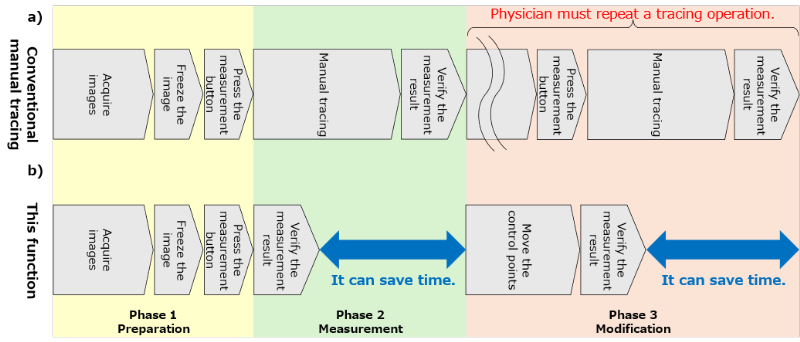 The key features of this function are automatic recognition of the nerve region and semi-automated measurement of cross-sectional area. This function is intended for diagnostic situations where quantitative evaluation of nerve cross-sectional area is required, such as assessment of the median nerve in carpal tunnel syndrome. With conventional manual tracing, physicians must draw a line following the contour of the nerve region, and the measurement task is time-consuming (Fig. 2a). In addition, if the contour of the nerve region requires correction, the physician must perform the manual tracing operation again.
