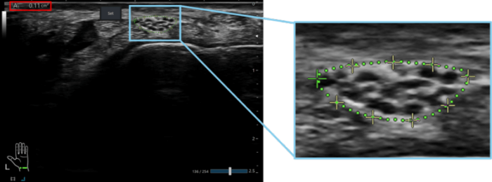 Fig.3 Example display of the automatically measured nerve contour (green dashed line) and the cross-sectional area value (inside the red box)