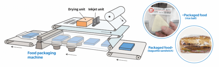 The printing system consists of an inkjet unit and a drying unit. The inkjet unit prints variable information such as product names and food labeling on the packaging film as it is conveyed, and the drying unit then dries and fixes the ink. The printed film is subsequently formed into a shape that encloses the food, followed by heat sealing and cutting to complete individual packages (Fig. 3).