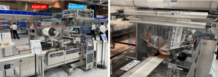 Fig. 2 Compact horizontal pillow-packaging machine with integrated water-based inkjet printing system (exhibited at JAPANPACK 2025)