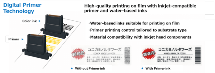 Konica Minolta’s water-based inkjet technology delivers high-quality printing on a wide range of substrates. The newly developed digital primer technology prints a primer immediately before the color inks, suppressing bleeding and repellency that would otherwise degrade image quality (Fig. 4).
