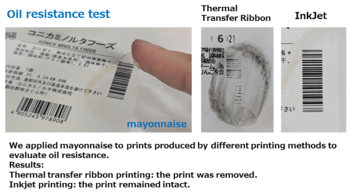 In addition, the resin design of the ink ensures strong adhesion to film substrates, and the printed ink film exhibits high oil resistance against oily substances such as mayonnaise (Fig. 5). These technologies facilitate printer downsizing and easier integration into packaging machines. The water-based inks are designed for food packaging applications; they are not subject to the Ordinance on Prevention of Organic Solvent Poisoning and comply with the positive-list system under Ministry of Health and Welfare Notification No. 370. This compliance ensures safety and enables confident use in food factories. The color lineup includes red, yellow, green, blue, and black. Direct printing of product names, promotional messages, logos, and other elements enhances shelf appeal and addresses diverse needs.