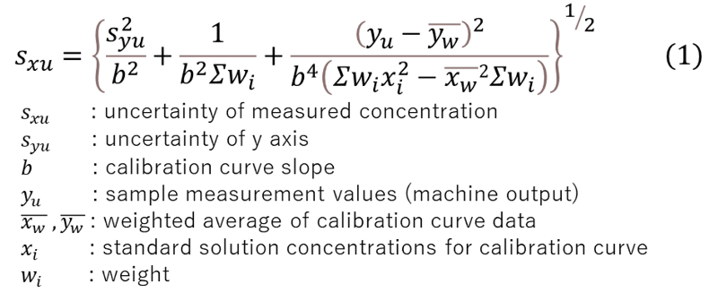 To improve accuracy, we add the internal standard directly to the digestion vessel after microwave digestion and maintains a fixed dilution regardless of concentration. A wide-range calibration curve is advantageous because environmental compliance samples are unknown. Performing evaluation in a single measurement using a wide-range calibration curve also reduces tools and workload. To satisfy these requirements, we use a relatively wide-range calibration curve that enables quantification from 1 ppb to 40 ppb. In instrumental analysis, measurement variation generally increases at lower concentrations; therefore, using a wide-range calibration curve reduces quantification accuracy at the low-concentration region. To ensure accuracy across the entire quantification range, we examined applying the weighted least-squares method. ISO/IEC 17025 requires calculation of uncertainty as a requirement. Because few publications discuss weighted uncertainty, we calculated it using Eq. (1) with reference to reports by Shikakume et al.2)3).
