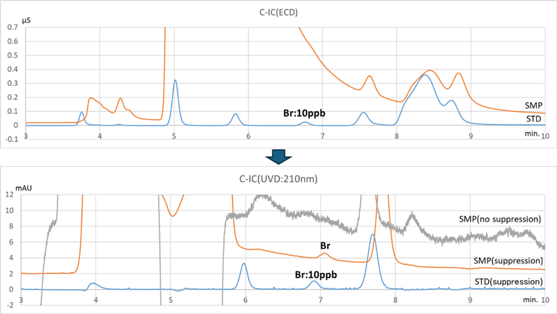For halogen analysis required for environmental compliance, we mainly use combustion ion chromatography. As an example of analysis difficult with general electrical conductivity detection(ECD), Fig. 2 shows measurement of trace bromine in polyvinyl chloride (PVC). To eliminate interference from the large amount of chlorine present, quantification is performed using ultraviolet detection(UVD).
