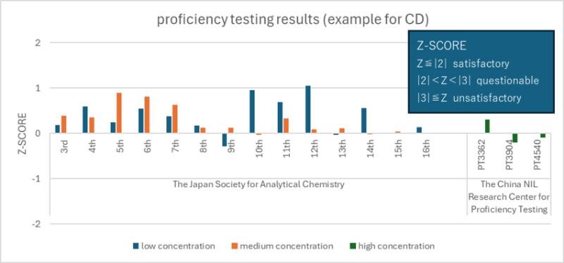To monitor competence and perform interlaboratory comparisons, we continuously participate in proficiency tests organized by The Japan Society for Analytical Chemistry and the China NIL Research Center for Proficiency Testing. We have achieved top-level performance across low to high concentrations (Fig. 3).