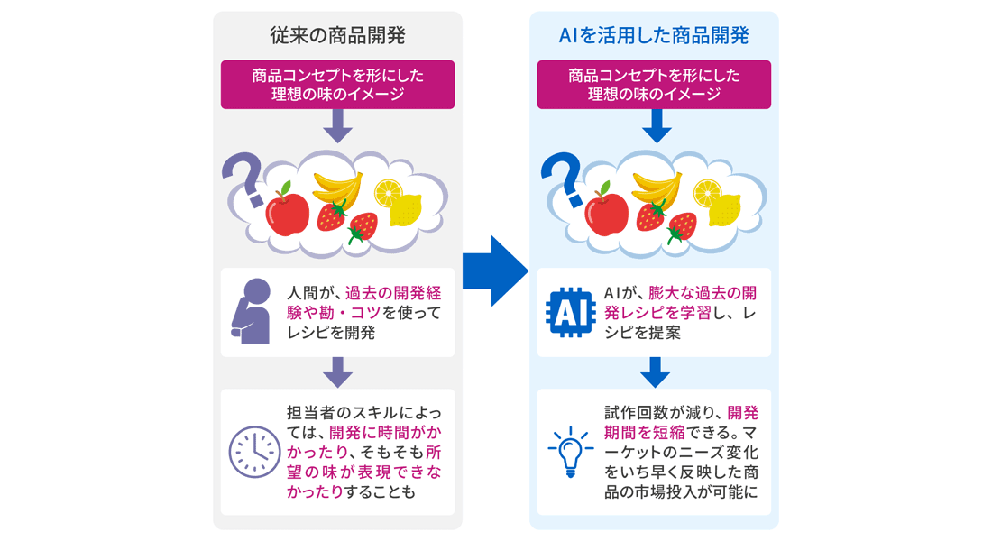 昨今のAIの進展により、味覚に関するデータを客観的に分析して数値化することが可能になりつつあります。過去のレシピデータの蓄積に加え、味覚データも活用し、AIに分析・学習させれば、商品開発を今まで以上に効率化することが可能です。現在の国内の事例では、開発したい商品のコンセプトなどをAIに入力して狙っている味を指示すると、過去の開発製品のデータベースを参照して、狙っている味に近づけるための原材料の配合や調整を、AIが提案してくれるようにまでなっています。